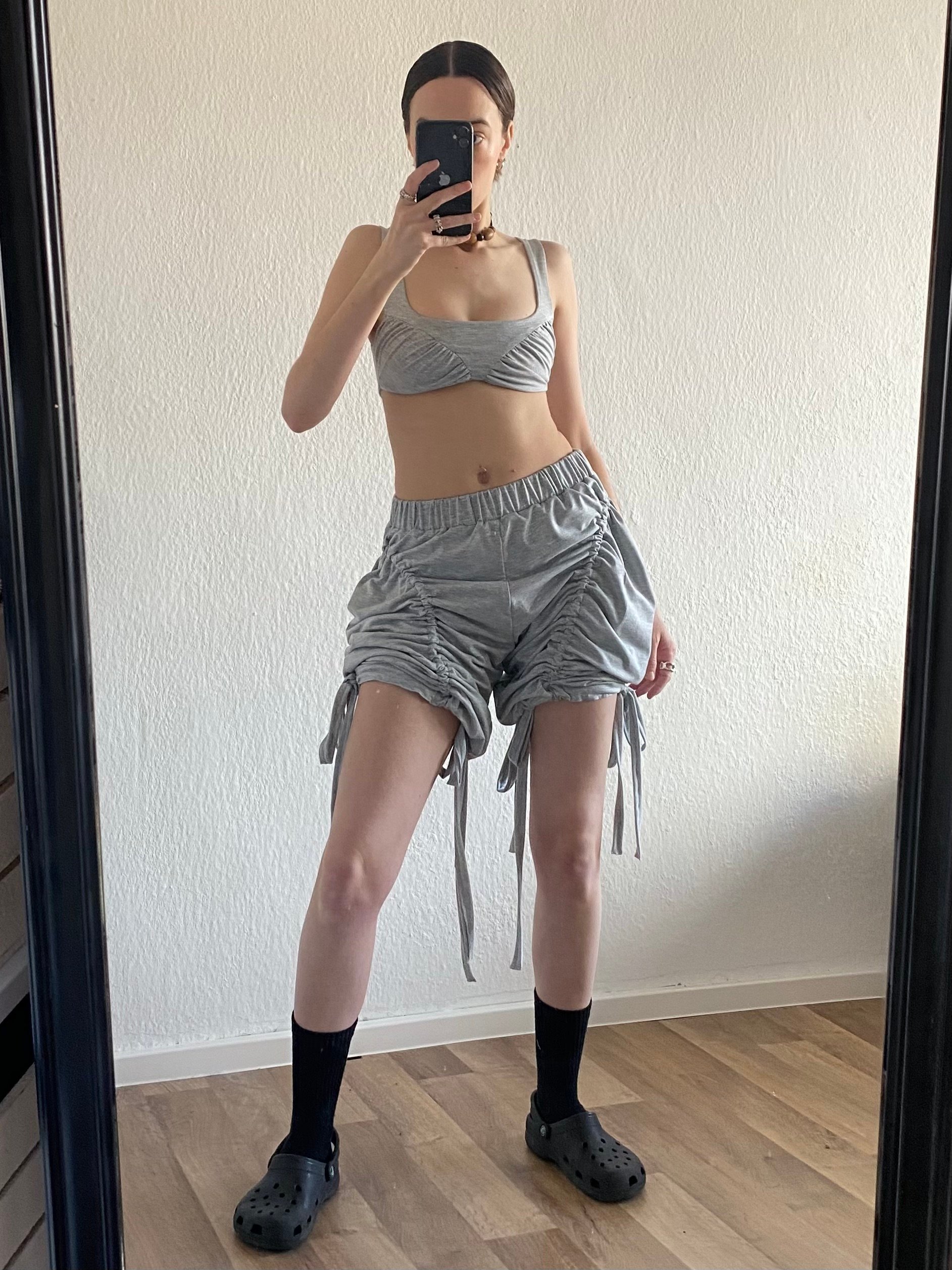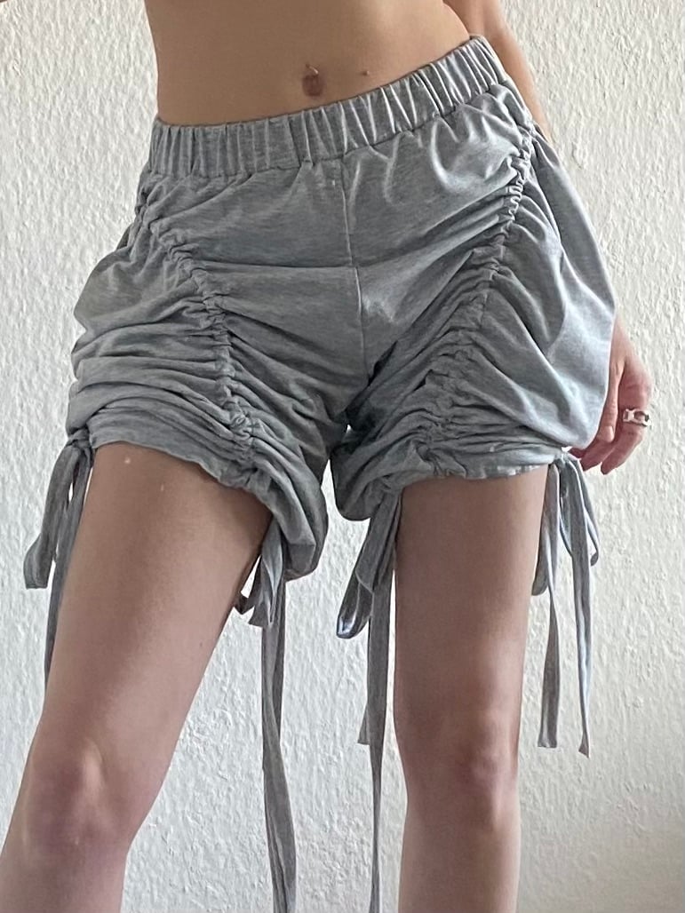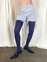 These bloomers are made from a soft grey marl cotton jersey. They can be worn untied as baggy cargo shorts, or can be tied using the long ribbons that thread through the leg panels and hem of the garment. They can be adjusted to create varying degrees of volume.